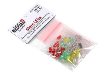 We all love lighting up lots of LEDs, so Expansion Pack #1 provides additional LEDs, resistors, and transistors to light up even more LEDs with your Blinky Lights kit! In addition to the red, green, and yellow LEDs, bi-color LEDs are also provided to allow experimentation with LEDs that can be either red or green!