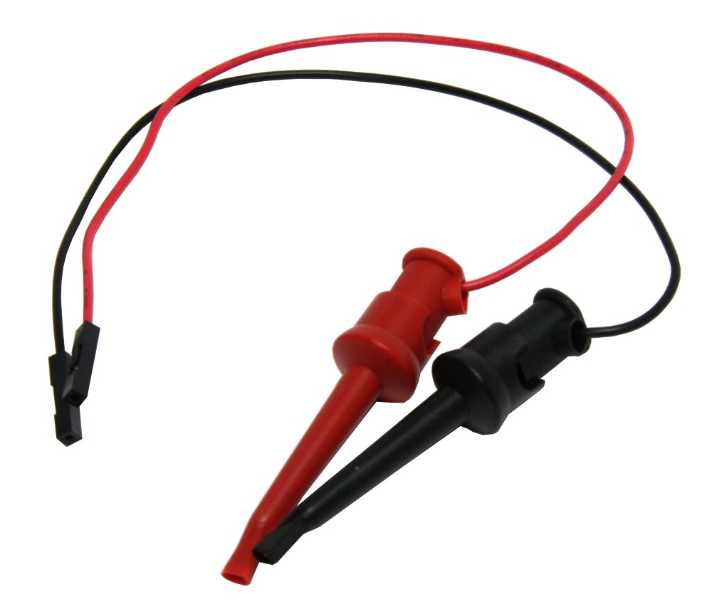 The CJ-F series wires have J-clip hooks and female sockets. They are great for making secure electrical off-board connections for your development board. The J-Clip grabs tightly to wires, parts, and pins to make a reliable connection. The J-Clip is better than alligator clips for connecting to connector header pins because it can connect to one pin without touching adjacent pins.