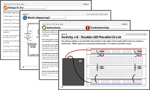 All Junior Genius Kits includes a color manual that's easy to read and full of information. The manual starts off with an introduction to the kit and its included parts. Multiple Activities progressively build up your knowledge and confidence in electronic circuits. Lessons are spaced throughout the Activities to teach you about the main electronic parts.