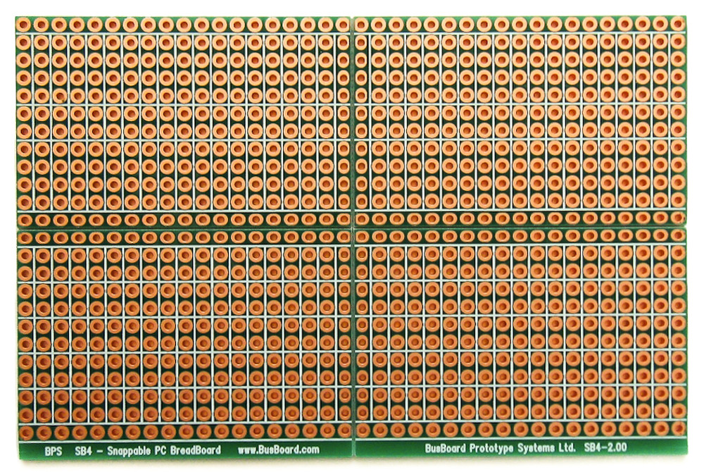 The SB4 Snappable PC BreadBoard is great for a small project, or four tiny projects. It can be used as a single prototyping board, or it can be snapped into two or four smaller boards. It is scored in two places along the middle to make snapping into smaller pieces easy. The SB4 solderable PC breadboard is great for making rugged prototypes.