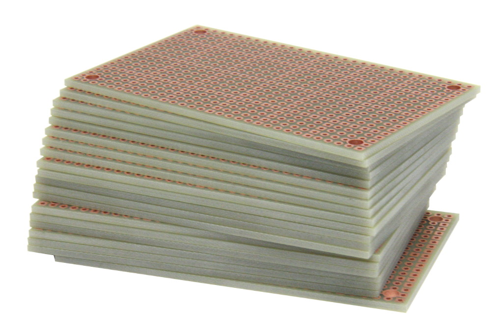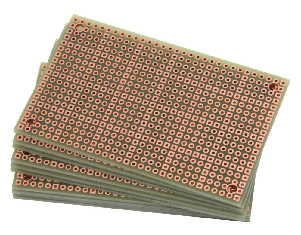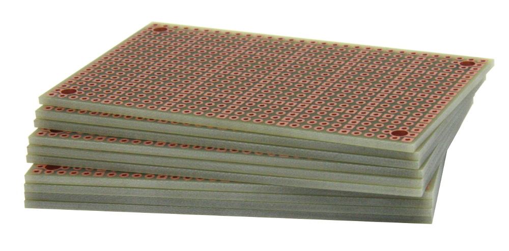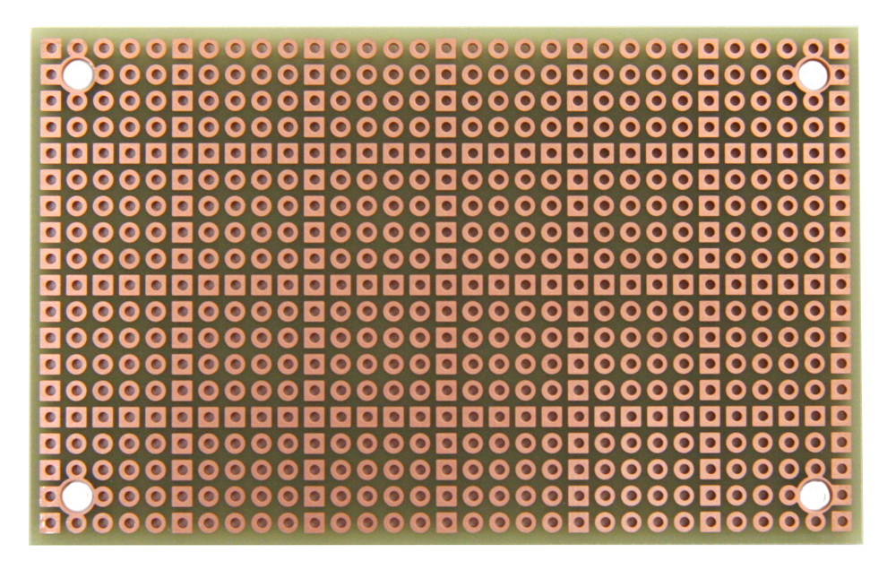 • Pad-per-hole prototyping board with plated-thru holes. A square pad every 5th hole makes it easy to align components on top and bottom.